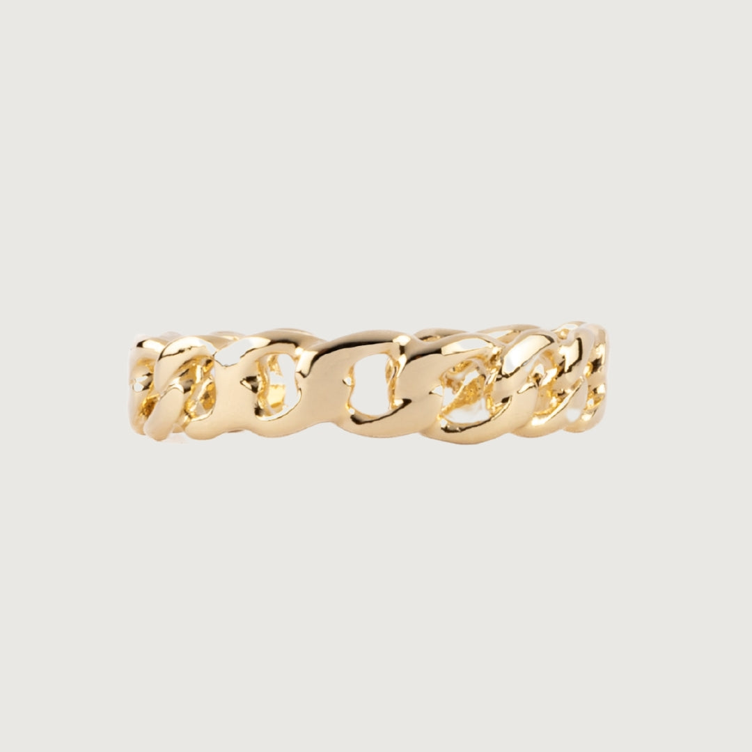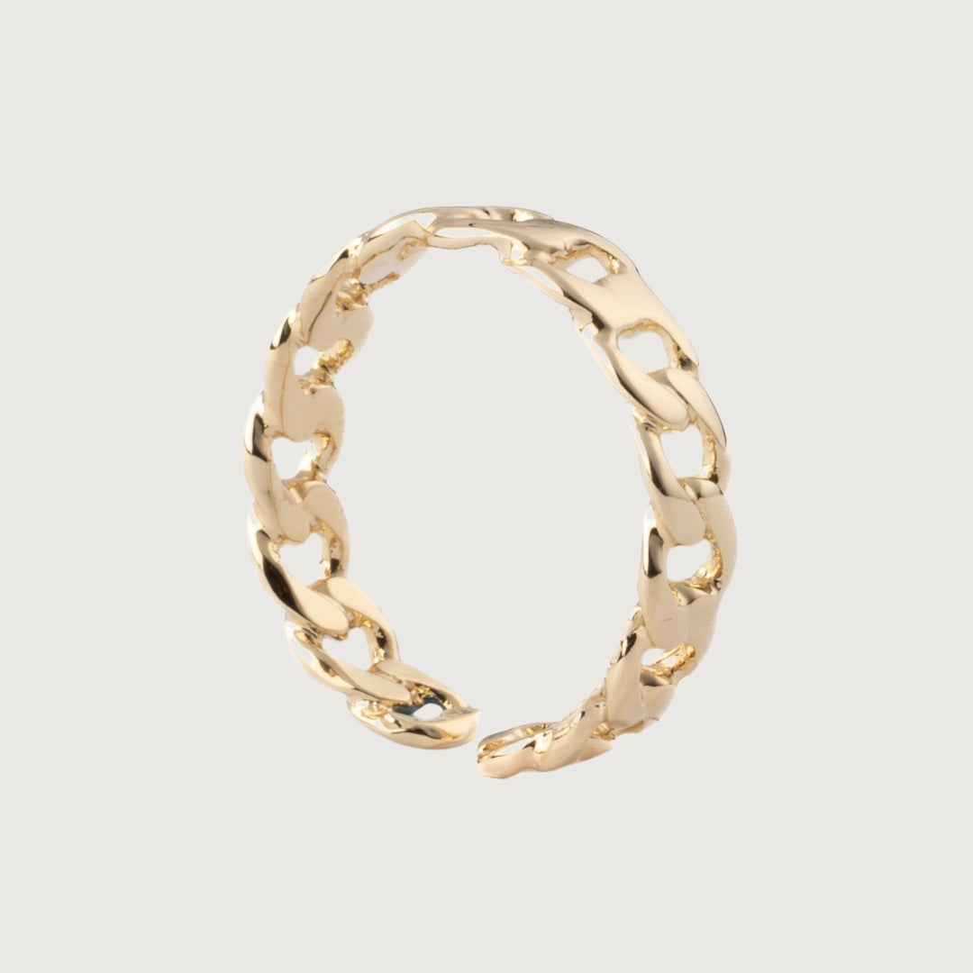 The Golden Chain Ring adds a touch of elegance to any outfit. Its unique design showcases a delicate chain, creating a stylish and sophisticated look. A must-have accessory for any fashion-forward individual.