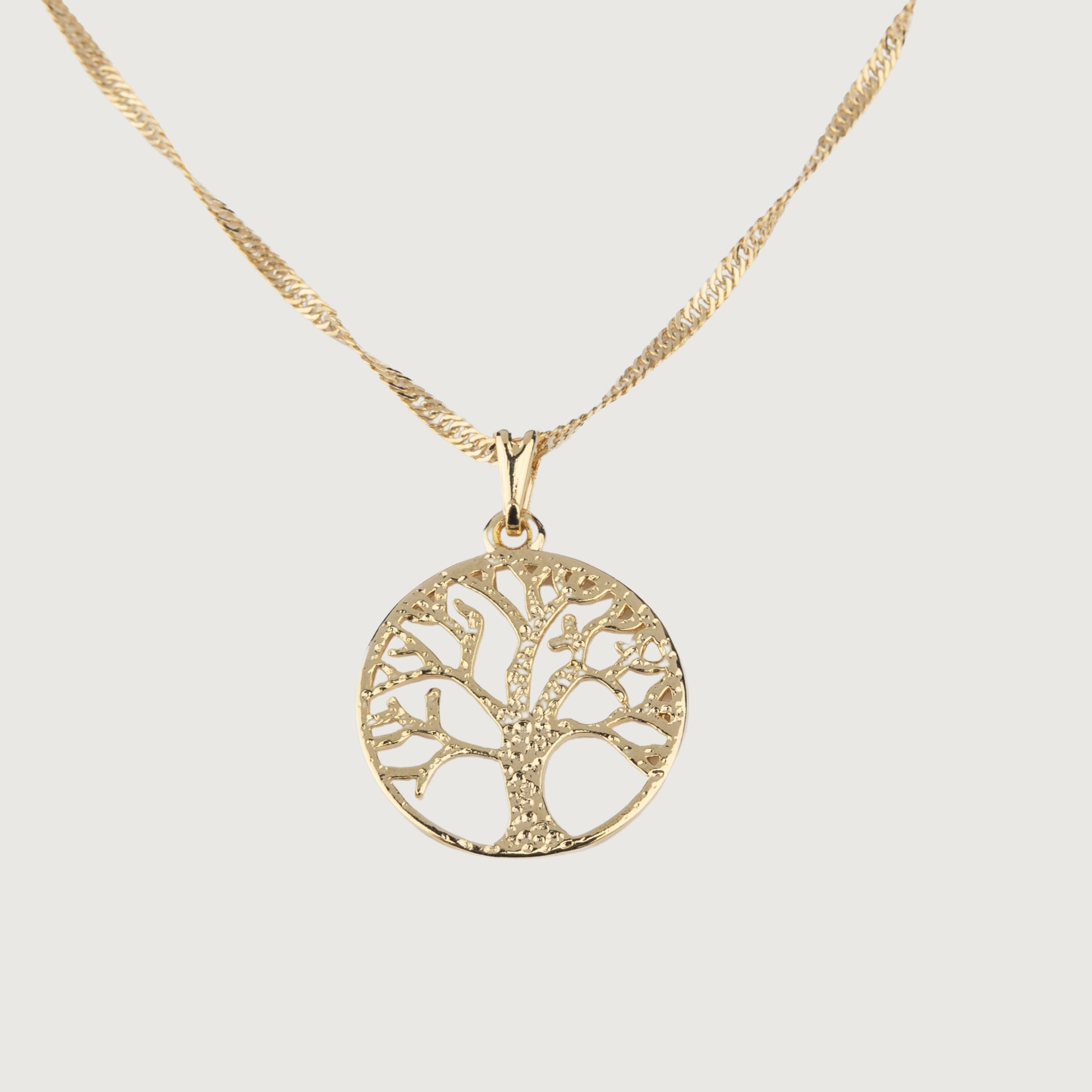 This stunning Golden Necklace features a beautifully crafted Tree of Life design, symbolizing the eternal cycle of growth and connection to nature. Made with high-quality materials, it is a timeless piece that adds a touch of elegance to any outfit. Perfect for those seeking a meaningful and stylish accessory.