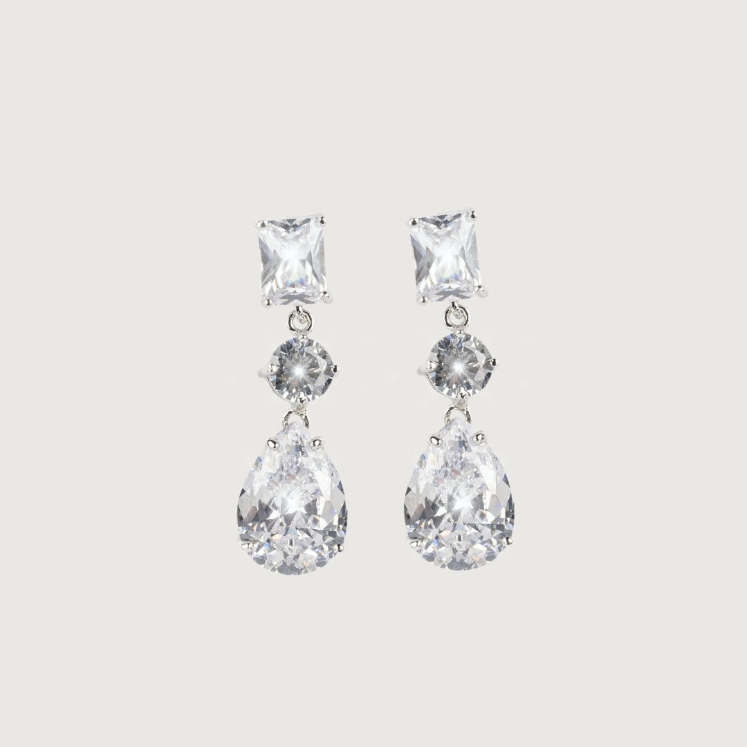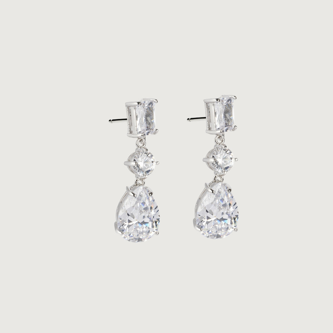 Expertly crafted, these Trio Drop Cubic Zirconia Dangle Earrings feature three distinct shapes - emerald-cut, round, and pear-shaped - adding variety and versatility to any outfit. Set with sparkling cubic zirconia stones for a luxurious and timeless look.